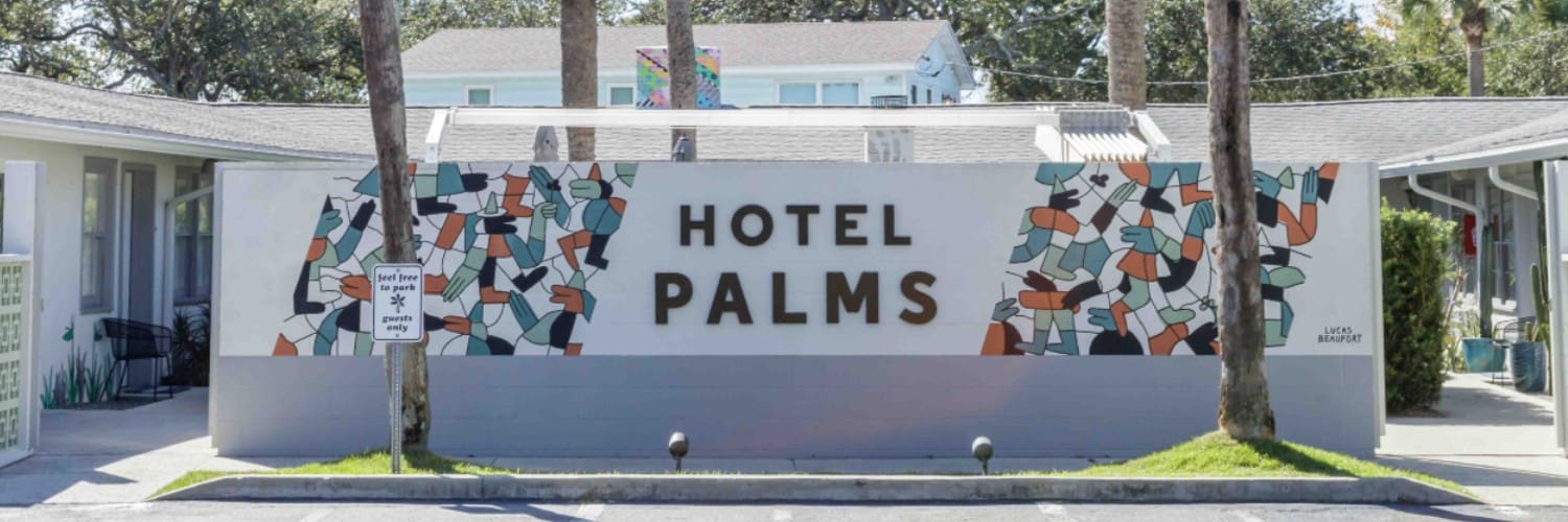 It’s funny how something as simple as traveling to a new city can refuel our creative energy and provide a fresh take on those things most familiar. That’s exactly what happened to North Florida native Greg Schwartzenberger after 2014 trip to Austin, where he and a friend stayed at Hotel San Jose, a refurbished 1930s bungalow-style motel. The concrete boutique hotel with its lush courtyard and twinkling lights reminded Greg of an old neighborhood landmark: the Palms Retro, a 1940’s–era motor-court motel in Atlantic Beach. Suddenly a place he had driven by without pause his entire life took on a new meaning. Inspiration struck on that serendipitous weekend in Austin, setting Greg, his wife Julie Schwartzenberger and sister Stevan Brown on a new journey to create magic at the classic inn back home.