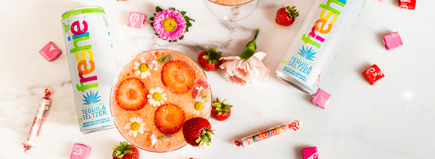 PREPARATION: Muddle strawberries and honey in a shaker. Add grapefruit juice, Blanco organic tequila and a generous handful of ice. Shake well. Top off with Freshie Lime Tequila Seltzer, and garnish as desired.