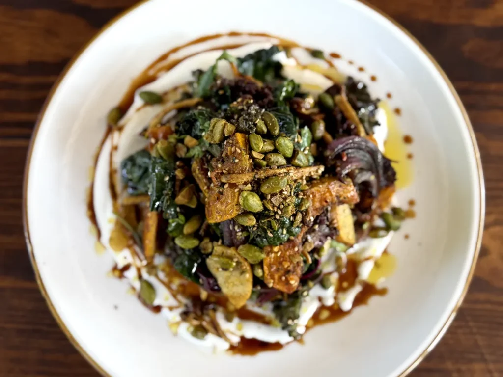 PREPARATION: Arrange pumpkin, onion and mushrooms on separate parchment-lined baking sheets. Drizzle all vegetables with olive oil and season generously with salt and pepper. Roast at 400 degrees until golden and tender, about 25 to 30 minutes for the pumpkin, flipping once halfway through; 20 to 25 minutes for the onion; 18 to 20 minutes for the mushrooms. Let vegetables cool slightly. Massage kale with a drizzle of olive oil and a pinch of salt for 30 to 60 seconds to soften the texture. Spread Greek yogurt across the bottom of a large serving platter. In a large bowl, gently toss roasted vegetables, kale and garam masala vinaigrette until just coated. Layer the dressed salad over the yogurt, and top with pear garnish, cilantro, scallions and pistachios. Serve warm or at room temperature alongside grilled meats.