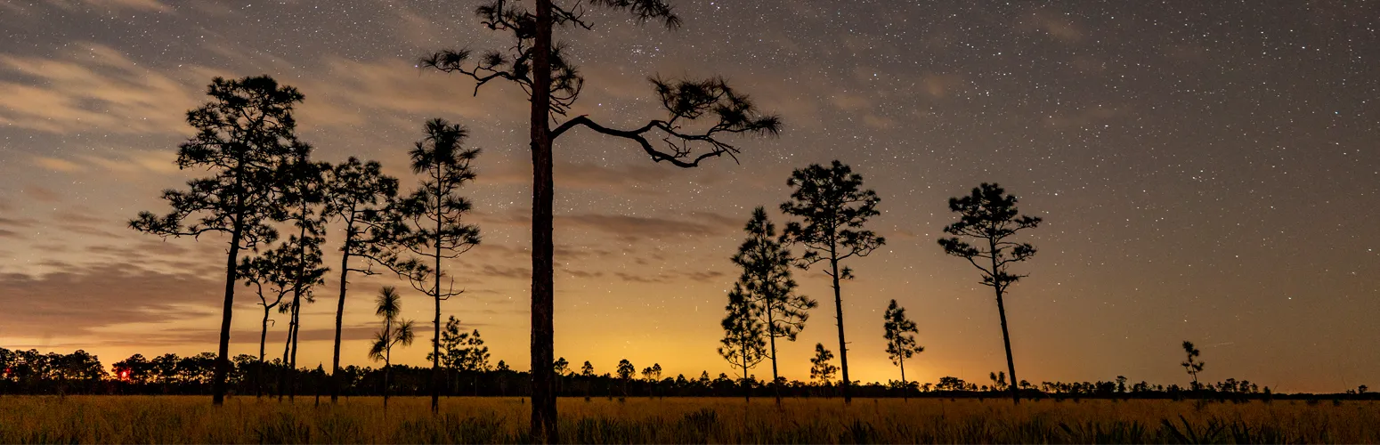 The Kissimmee River Valley is one of the last official Dark Sky regions in Florida—where the land is far enough from city lights to clearly see stars at night. My purpose in this composition was to show the unique view that had been preserved by framing mature longleaf pines against the night sky. The faint lights on the horizon from the Florida Turnpike are amplified by a long exposure, hinting of the different future that could have been.